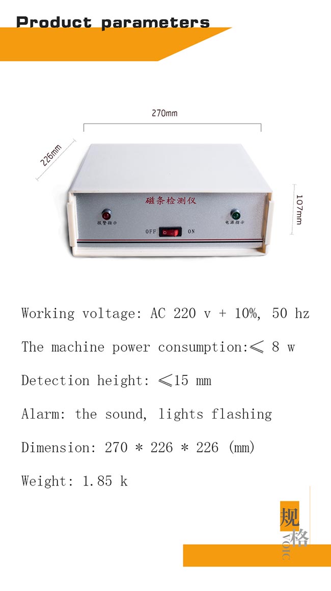 This apparatus is used to detect whether the magnetic strip on commodities is in good condition without damage. Main technical indicators: