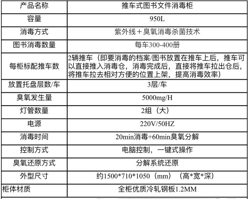 3.圖書消毒冊數(shù):該圖書消毒柜專用推車為 3 層放置框,每框可放置 2cm 厚度 的圖書 100-130 冊,消毒冊數(shù)為 300-400 冊。